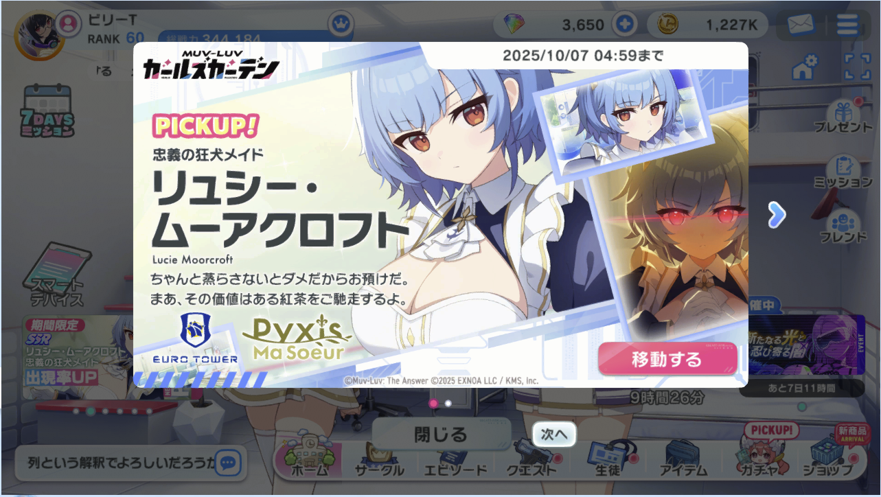 スポンサーリンク マブガル:「新たなる光と忍び寄る闇」7日目! Muv-Luv Girls GardenMGGタイトル20250903 X Facebook はてブ LINE コピー 2025.09.22 学園日誌 さっきメンテが明けました! また首位を取っているので(R18版)、石が配られた上に新規キャラ実装だ。 MGGSS20250922-1 シナリオも公開された。 MGGSS20250922-2 今から読みます。 盛り上がって嬉しい……。 自分も協力出来てるかな。課金は最低限だけど。 本日は以上! 共有: クリックして X で共有 (新しいウィンドウで開きます) X Facebook で共有するにはクリックしてください (新しいウィンドウで開きます) Facebook