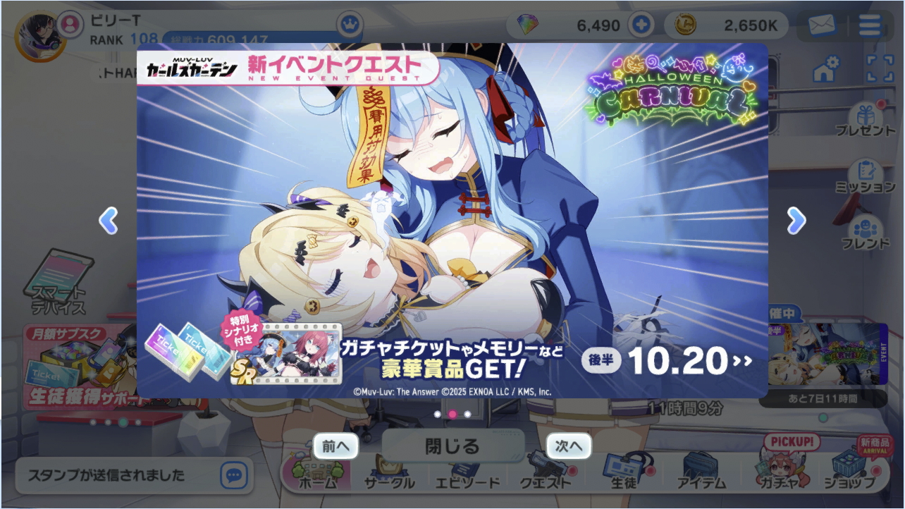 スポンサーリンク マブガル:「HALLOWEEN CARNIVAL」8日目! Muv-Luv Girls GardenMGGタイトル20250903 X Facebook はてブ LINE コピー 2025.10.21 学園日誌 昨日の17:30頃に色々更新。 MGGSS20251021-1 MGGSS20251021-2 ガチャは交換でエヴィを入手。 MGGSS20251021-3 昨日行けるところまで行った。 MGGSS20251021-4 この後も進めます。 本日は以上! 共有: クリックして X で共有 (新しいウィンドウで開きます) X Facebook で共有するにはクリックしてください (新しいウィンドウで開きます) Facebook