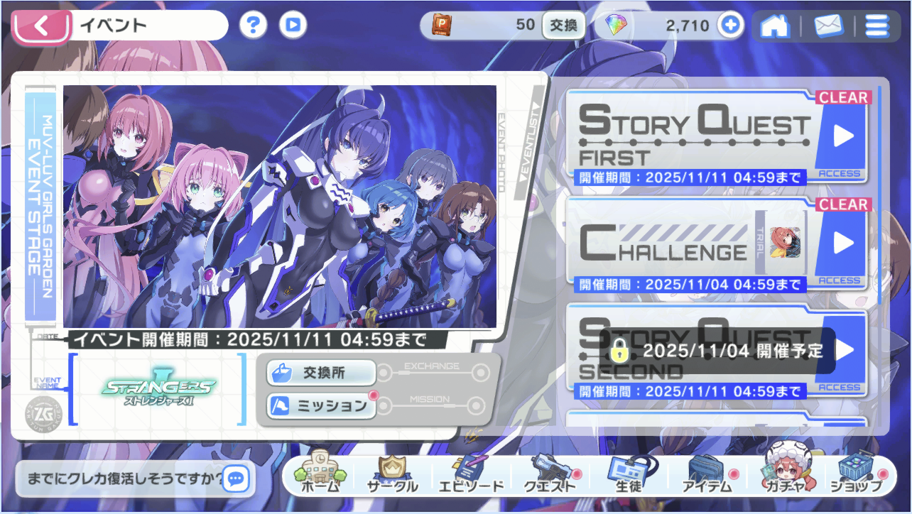 スポンサーリンク マブガル:「STRANGERS I」5日目! Muv-Luv Girls GardenMGGタイトル20250903 X Facebook はてブ LINE コピー 2025.11.01 学園日誌 更新されたクエストを消化。 MGGSS20251101-1 MGGSS20251101-2 デイリーも消化。 MGGSS20251101-3 ガチャはさっぱりですね。純夏さん来ない……。 MGGSS20251101-4 SSRは出るには出る。割と。 ともあれ、この後も進めます。 本日は以上! 共有: クリックして X で共有 (新しいウィンドウで開きます) X Facebook で共有するにはクリックしてください (新しいウィンドウで開きます) Facebook