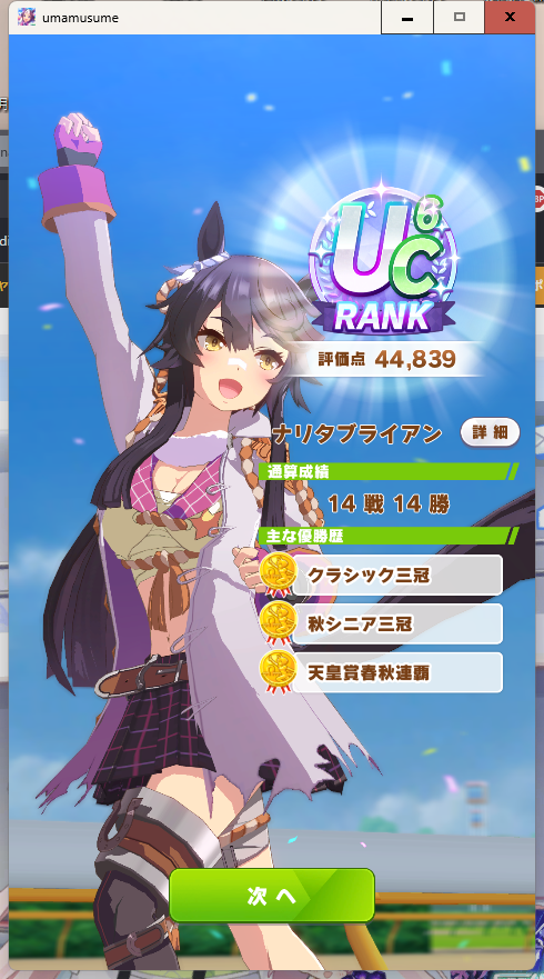 ウマ娘ナリタブライアンを育成しました。