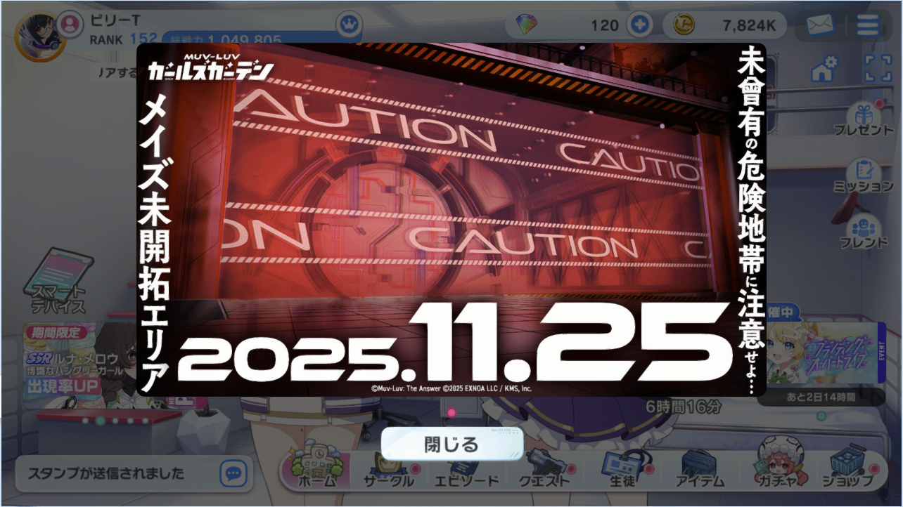 スポンサーリンク マブガル:「ブランディングオーバードライブ」12日日! Muv-Luv Girls GardenMGGタイトル20250903 X Facebook はてブ LINE コピー 2025.11.22 学園日誌 こちらも一旦平時に戻る。 デイリー消化。 MGGSS20251122-1 サークル対抗制圧戦の結果はこう。 MGGSS20251122-2 新要素? の告知が。 MGGSS20251122-3 メイズは100層から先が強くてまだ攻略出来ないので、戦力強化に努めます。 本日は以上! 共有: クリックして X で共有 (新しいウィンドウで開きます) X Facebook で共有するにはクリックしてください (新しいウィンドウで開きます) Facebook
