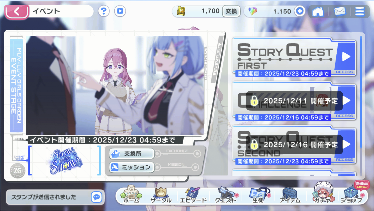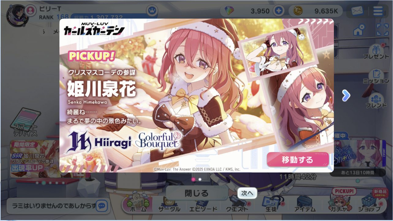 スポンサーリンク マブガル:「Show in the Snow」初日! Muv-Luv Girls GardenMGGタイトル20250903 X Facebook はてブ LINE コピー 2025.12.09 学園日誌 今日は17時までメンテ。 MGGSS20251209-1 明けて新イベントだ! MGGSS20251209-2 MGGSS20251209-3 早速行けるところまで読む。 MGGSS20251209-4 MGGSS20251209-5 MGGSS20251209-6 定番中の定番の流れ。どっかで見た……うっ、頭が……。 取り敢えずデイリーを終わらせる。 MGGSS20251209-7 この後も進めます。 本日は以上! 共有: クリックして X で共有 (新しいウィンドウで開きます) X Facebook で共有するにはクリックしてください (新しいウィンドウで開きます) Facebook