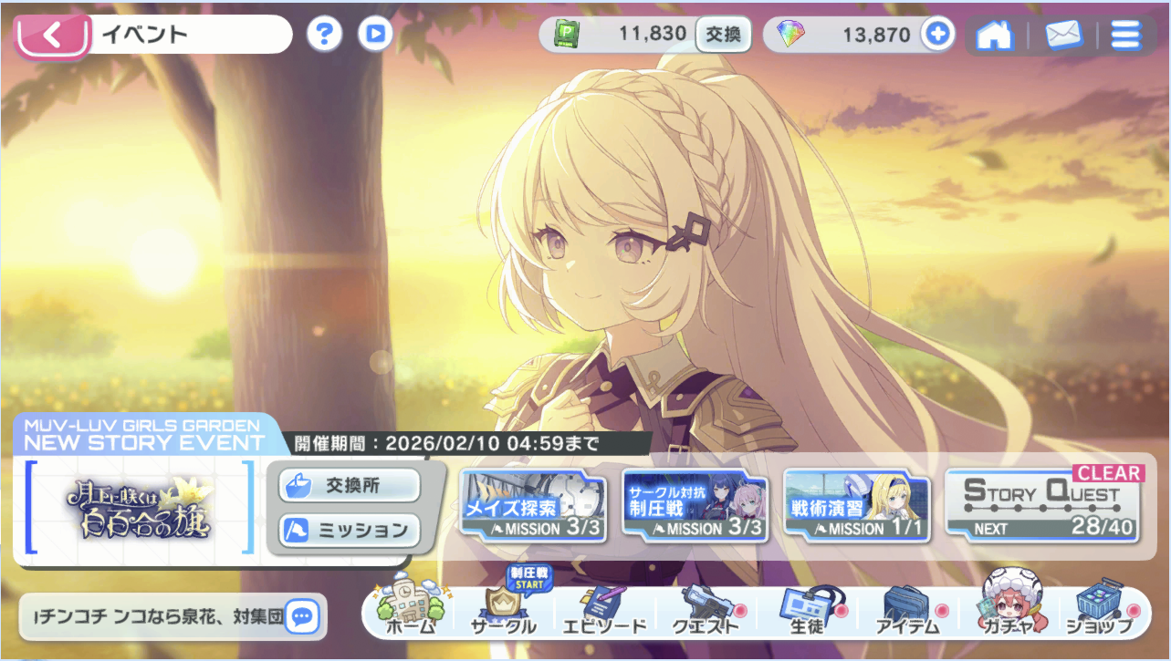 スポンサーリンク マブガル:「月下に咲くは白百合の旗」6日目! Muv-Luv Girls GardenMGGタイトル20250903 X Facebook はてブ LINE コピー 2026.02.01 学園日誌 今日はサークル対抗制圧戦の更新がありました。 MGGSS20260201-1 MGGSS20260201-2 今日も進められるところまで。 MGGSS20260201-3 デイリーも消化。 MGGSS20260201-4 またこの後も進めます。 本日は以上! 共有: クリックして X で共有 (新しいウィンドウで開きます) X Facebook で共有するにはクリックしてください (新しいウィンドウで開きます) Facebook
