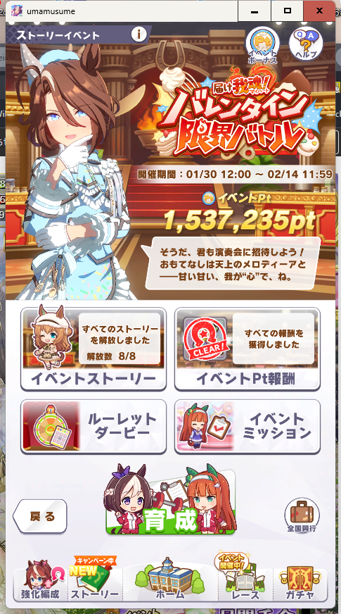 スポンサーリンク ウマ娘:2026年02月イベントそのなな。 ウマ娘ウマ娘202602イベントタイトル X Facebook はてブ LINE コピー 2026.02.06 トレーナー日誌 昨日も育成。 ウマ娘SS20260206-1 ウマ娘SS20260206-2 ポイント完走は終わりました。 まだ残り期間があるので、育成は続けます。 本日は以上! 共有: X で共有 (新しいウィンドウで開きます) X Facebook で共有 (新しいウィンドウで開きます) Facebook