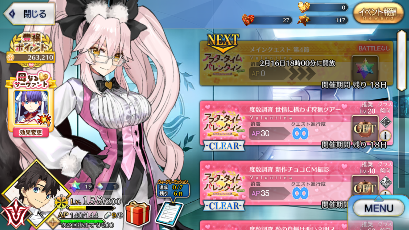 スポンサーリンク FGO:「アフタータイム・バレンタイン2026 ~お母さんチョコの謎~」4日目。 Fate/Grand OrderFGO2026バレンタインイベントタイトル X Facebook はてブ LINE コピー 2026.02.16 弊カルデア日誌 イマココ。 FGOSS20260216 この後も進めます。 本日は以上! ※以下のリンクはアフィリエイトです。 Fate/Grand Order material XIV (TYPE-MOON BOOKS) posted with AmaQuick at 2026.02.16 TYPE-MOON (その他)¥1,485 Amazon.co.jpで詳細を見る 共有: X で共有 (新しいウィンドウで開きます) X Facebook で共有 (新しいウィンドウで開きます) Facebook