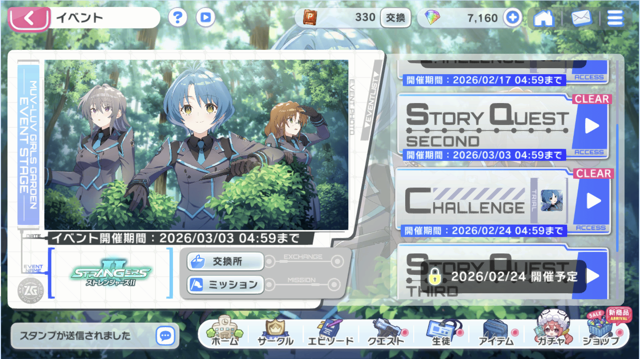 スポンサーリンク マブガル:「STRENGERS II」12日目! Muv-Luv Girls GardenMGGタイトル20250903 X Facebook はてブ LINE コピー 2026.02.21 学園日誌 今日も更新分を進めました。 MGGSS20260221-1 MGGSS20260221-2 デイリーも消化。 MGGSS20260221-3 週末はゆっくりメイズ探索とかバトルシミュレートとか進めます。 本日は以上! 共有: X で共有 (新しいウィンドウで開きます) X Facebook で共有 (新しいウィンドウで開きます) Facebook